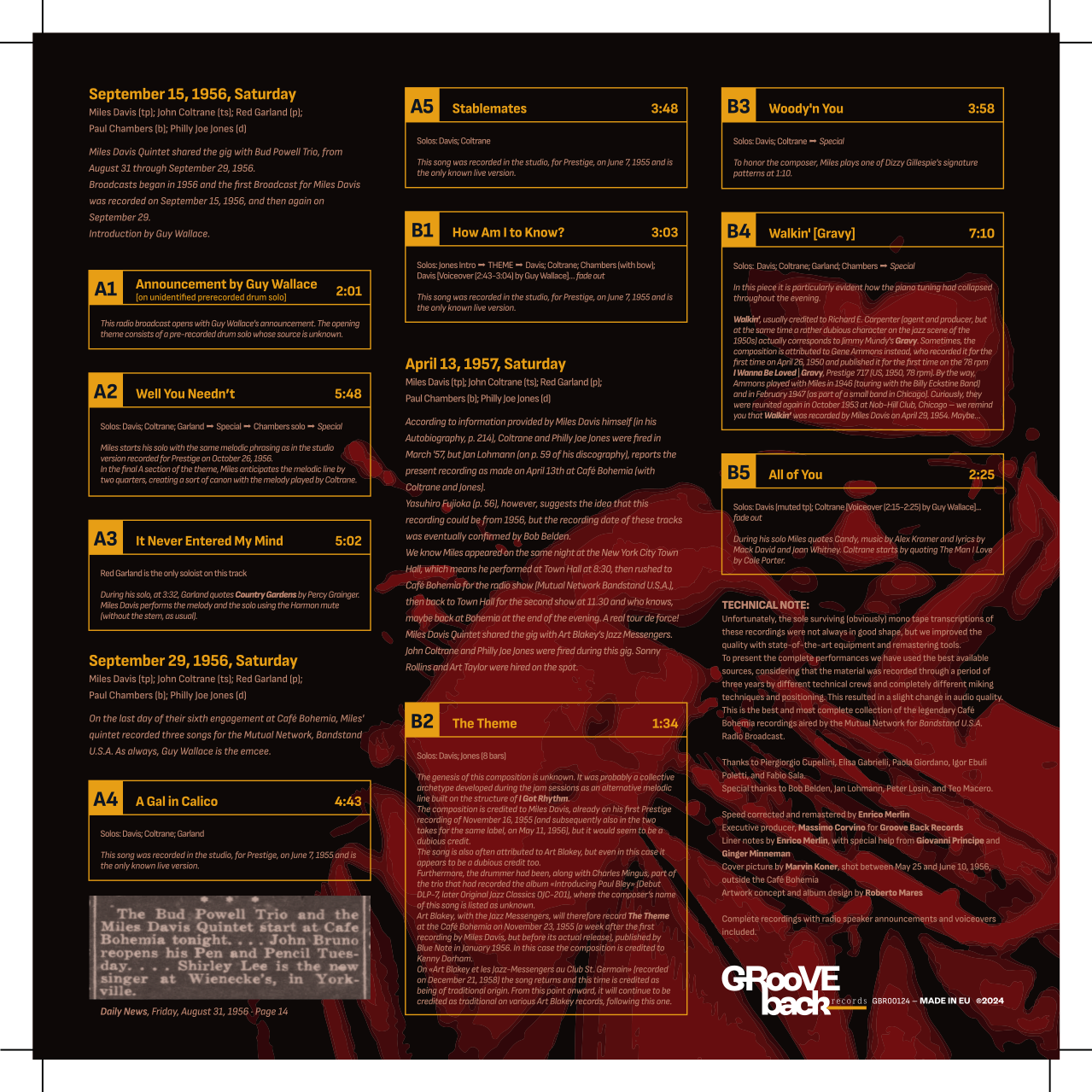 完全なパフォーマンスを提示するために、素材が異なる技術スタッフ、まったく異なるマイキング技術とポジショニングによって 3 年間にわたって録音されたことを考慮し、入手可能な最高のソースを使用しました。これにより、オーディオ品質がわずかに変化しました。これは、Bandstand USA Radio Broadcast の Mutual Network によって放映された、伝説的な Café Bohemia 録音の最高かつ最も完全なコレクションです。